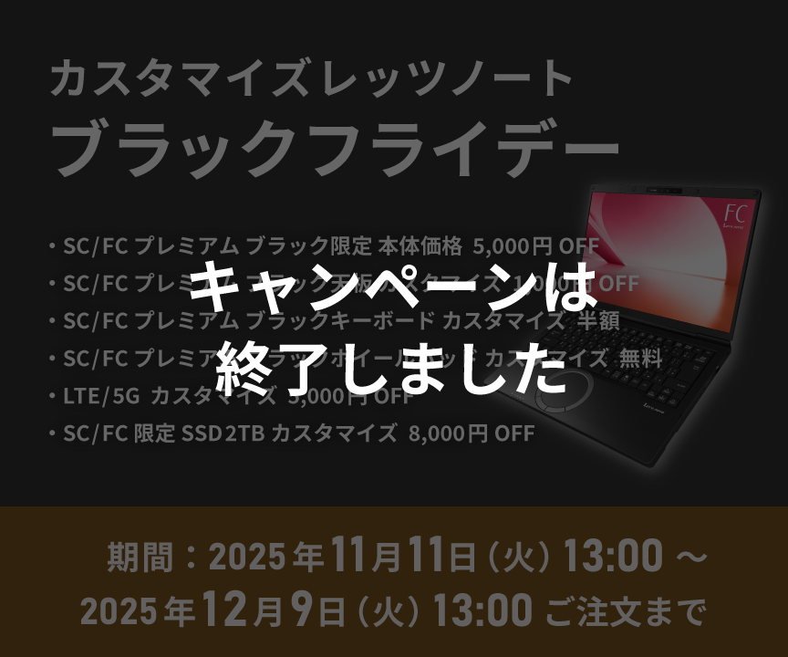 カスタマイズレッツノート SC/FC プレミアム 対象機種(カームグレイ)の、ジェットブラック天板へのカスタマイズ料金が1,000円OFFになります。