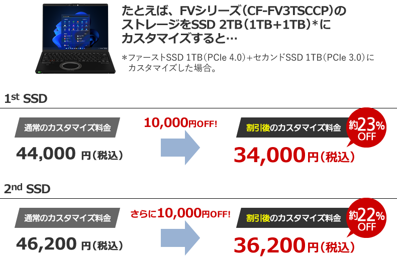 カスタマイズレッツノートをご購入の際にストレージをカスタマイズし、SSD1TBまたは2TB選択時にクーポンのご利用で、SSDのカスタマイズ料金が最大20,000円OFF*となる割引キャンペーンを実施中!FVシリーズ プレミアムエディションのセカンドSSDも対象です。