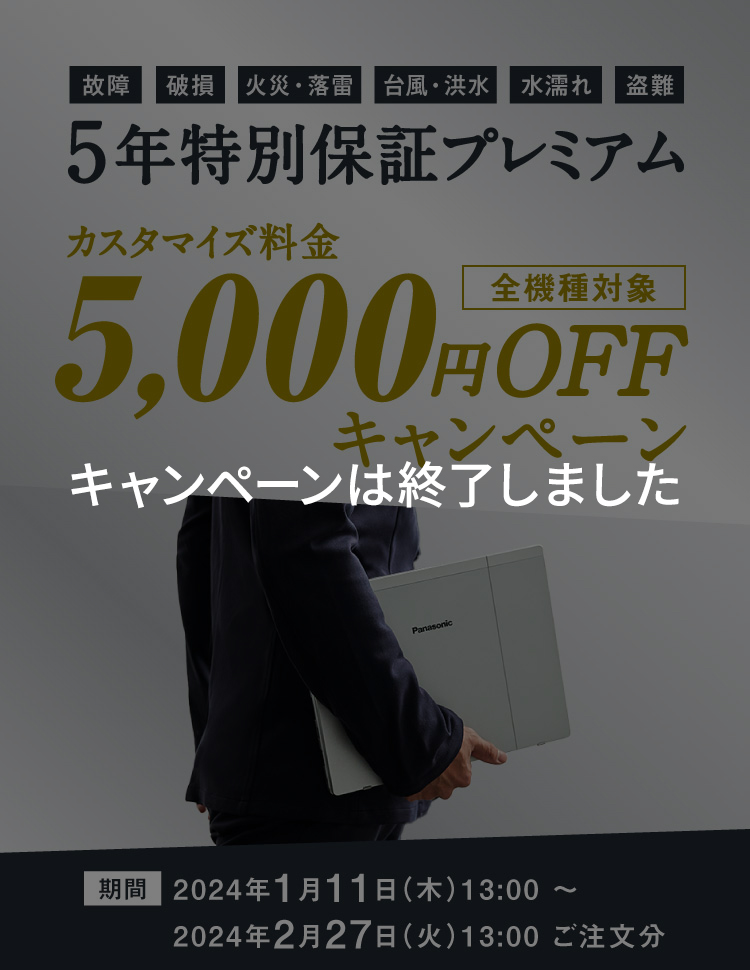 カスタマイズレッツノートご購入の際に「5年特別保証プレミアム」を含むメニューを選択し、クーポンコードを入力いただくと、カスタマイズ金額が5,000円OFF!