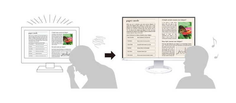 あたかも紙のような見え方に切替えできる「Paperモード」を搭載。一般的な液晶モニターに比べ、輝度、コントラスト比を抑え、画面を暖色系の色味にすることで、ブルーライトの量を低減。自動調光機能Auto EcoViewとの併用で、ブルーライトを約80%カットします。
