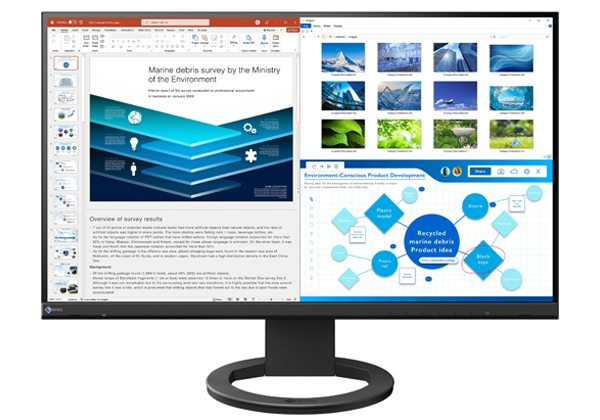 EV2720Sは、27型WQHD(2560×1440ピクセル)解像度の4辺フレームレスモニターです。一般的なフルHD(1920×1080ピクセル)モニターの約1.8倍となる広い作業領域により、複数のウィンドウを重ならずに表示できます。頻繁なウィンドウの切替えやスクロールの手間を軽減し、デスクワークの効率を向上させます。