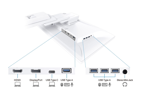 4ポート(Type-A)のUSBハブを搭載。ドッキングステーションの代わりに、キーボードやマウスなどのUSB機器をモニターに接続しておけば、ノートPCとモニターをUSB Type-C®ケーブル1本で接続するだけで、周辺機器をすぐに使用できます。