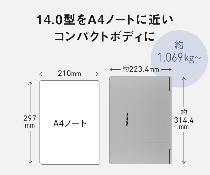14.0型ながらA4サイズのノートに近く、⼀円硬貨の直径(20.0mm)よりも薄いスリム&コンパクトボディを実現しています。