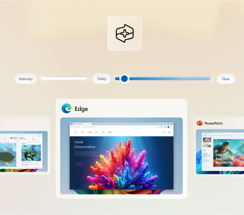 - ※1 リコール(プレビュー版)を利用するには、Windows Hello による本人確認とデバイス暗号化などのセキュリティ機能が有効である必要があります。対応言語は英語、中国語(簡体)、フランス語、ドイツ語、日本語、スペイン語です。コンテンツの種類や保存容量に制限があります。一部のポリシー対応管理機能には、エンタープライズライセンスが必要です。