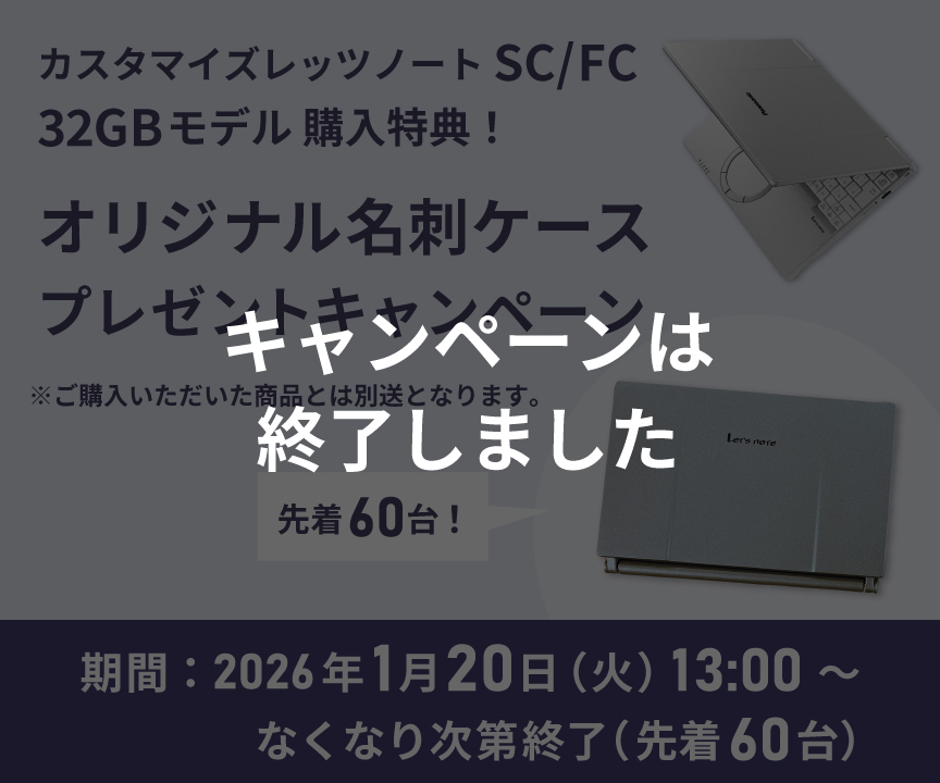 カスタマイズレッツノートSC/FC 32GBモデルをご購入いただいた方(先着60台)に、レッツノート特製のオリジナル名刺ケースをプレゼントいたします。