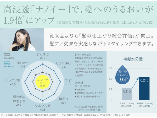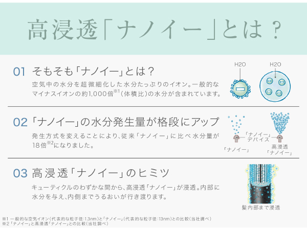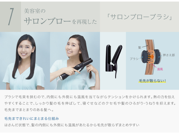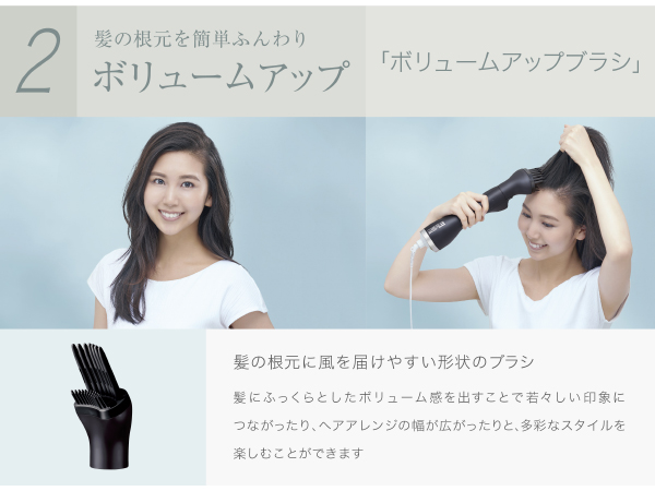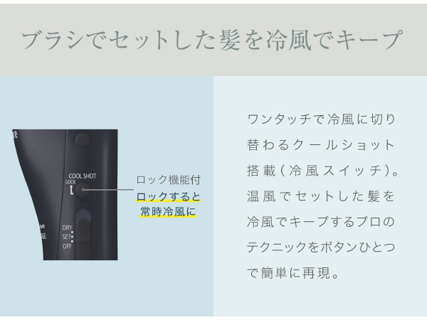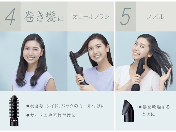 ・水分発生量18倍の高浸透「ナノイー」搭載で、髪に驚きのうるおいと、なめらかさ。・多彩なアタッチメント搭載で、思い通りのスタイリング。・押すだけワンタッチで冷風に切替できるクールショット(冷風スイッチ)で、温風でセットした髪を冷風でキープするプロのテクニックが簡単に。 商品詳細はこちらから