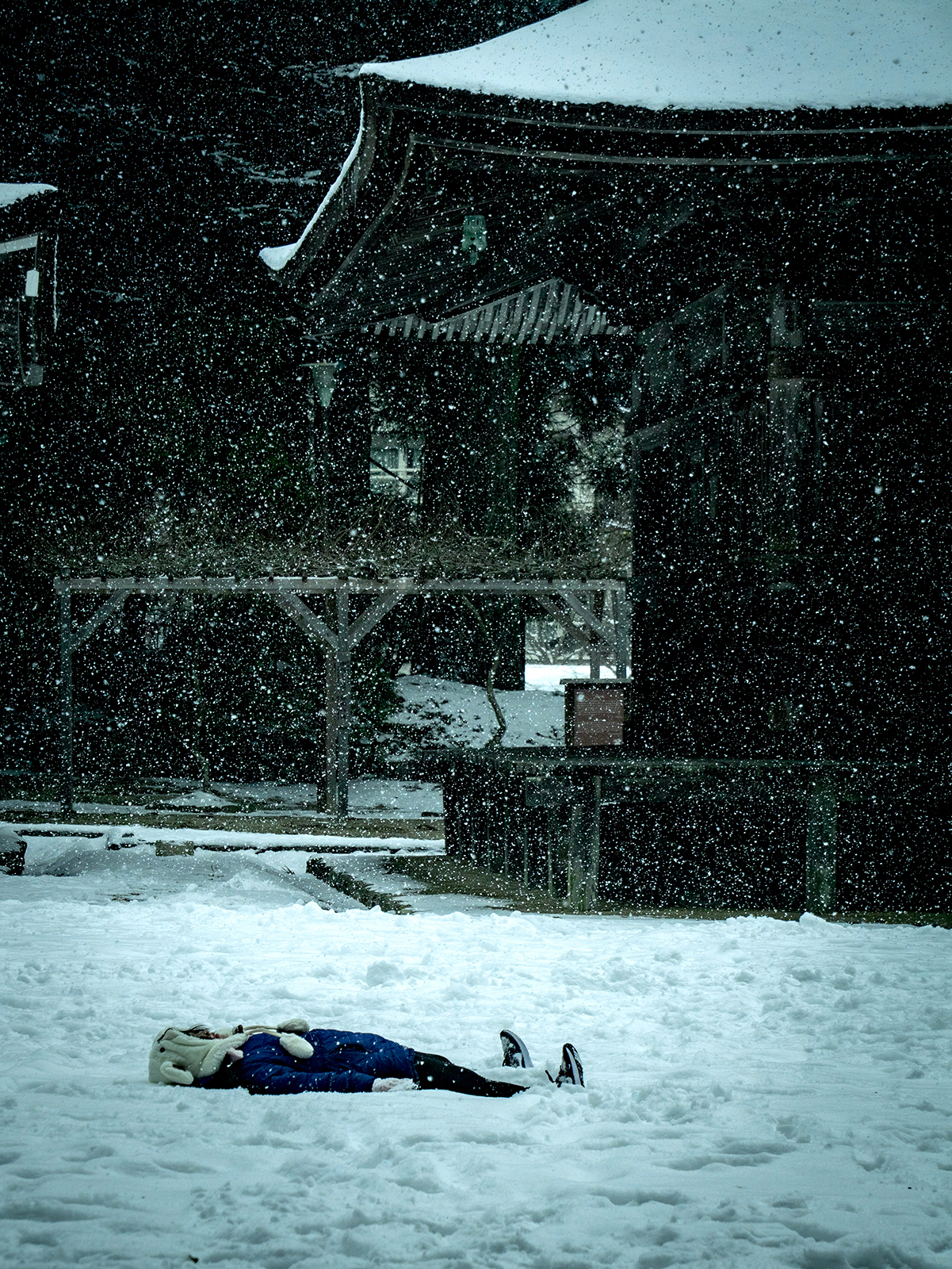 神社の境内なのか、お寺の境内なのか、良く分かりませんが、しんしんと降る雪の中で仰向けに寝転んで雪を感じているのが伝わってきます。下手に明るく撮影せず、薄暗い調子で撮影されたのも良い結果に繋がりました。都会では子どもの遊び場所がどんどん少なくなり、部屋の中でゲームをして遊ぶ子が多く、この写真のような体験が減ってきています。そう言った意味でも貴重な写真です。おめでとうございます。あなたの作品がグランプリです!これからも日常に目を向けて、素晴らしいスナップ撮影を楽しんでください。