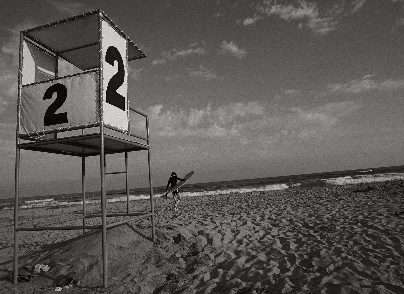 本来であれば、カラーで撮りたくなるような青い空が広がるワンシーンですが、あえてモノクロで撮影することで、サーフィンをするために海へと向かう人物に自然と視線誘導されます。左側に見張り台と人物を捉え、右半分に空間を持たせることで、人物に動きが生まれ、浜辺の広がりを感じさせます。ここから何か物語が始まるような、続きを見たくなるよう な作品です。