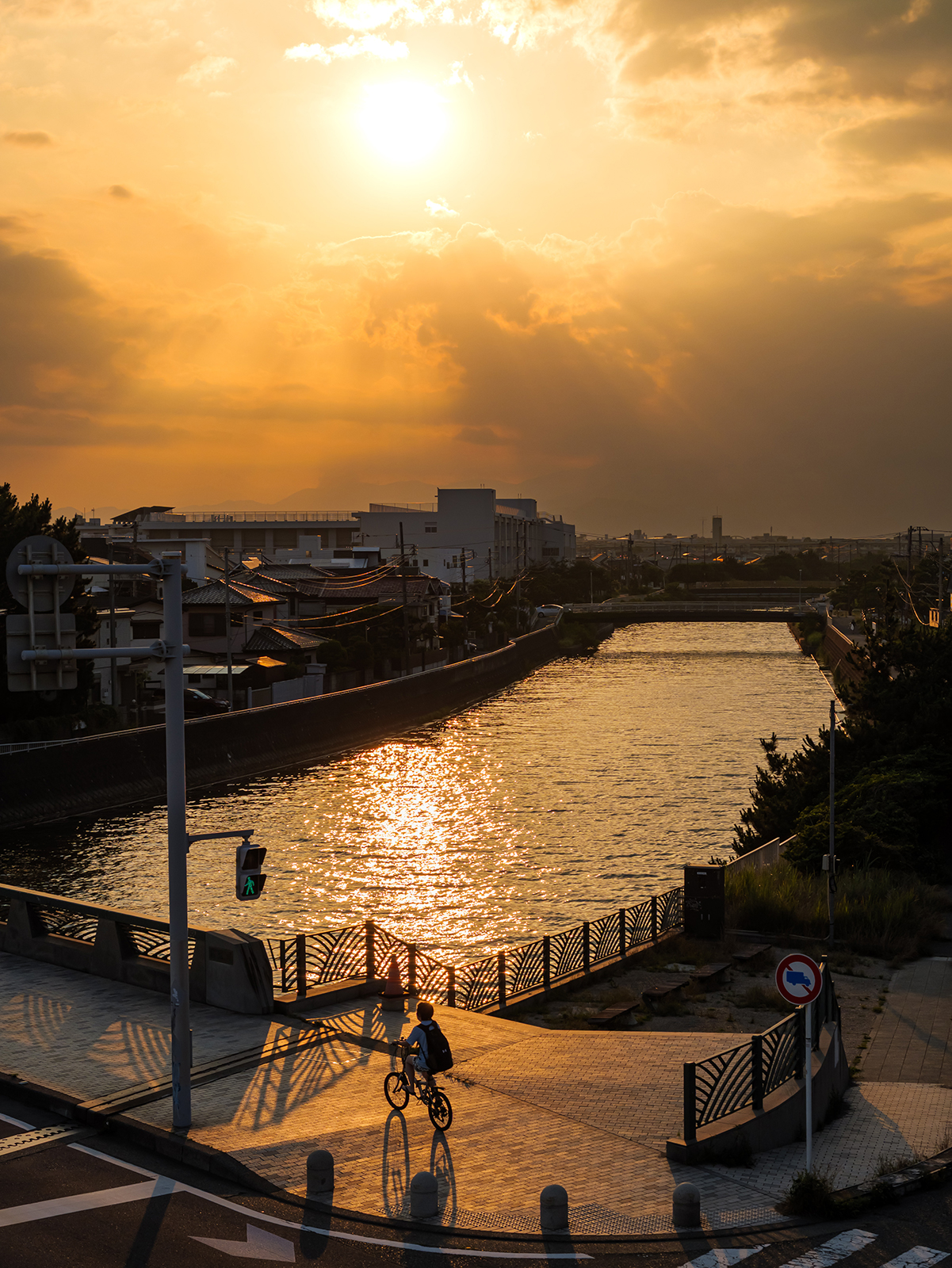 上田賞おめでとうございます。こちらの作品は日常の美しい風景をしっかりとドラマチックに表現された一枚だと思います。川沿いの一見どこにでもあるような町の風景ですが、夕日に照らされた川と道、そしてアクセントになっている自転車に乗った方のバランスがお見事だと思いました。自転車の方を捉えるタイミングもバッチリですし、交通標識や信号、電信柱などもしっかりとまとめて良い作品になっていると思いました。
