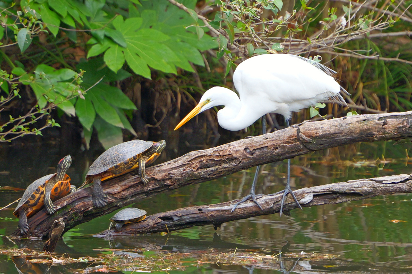 撮影者コメント : 近所の公園の池で、木の上にいたサギが、水面の枝に降りてきて、亀と何やら餌場の「情報交換」をしているように見えました。後ろの奥さん亀が、「きっとサギよ!」と言っているのかも。