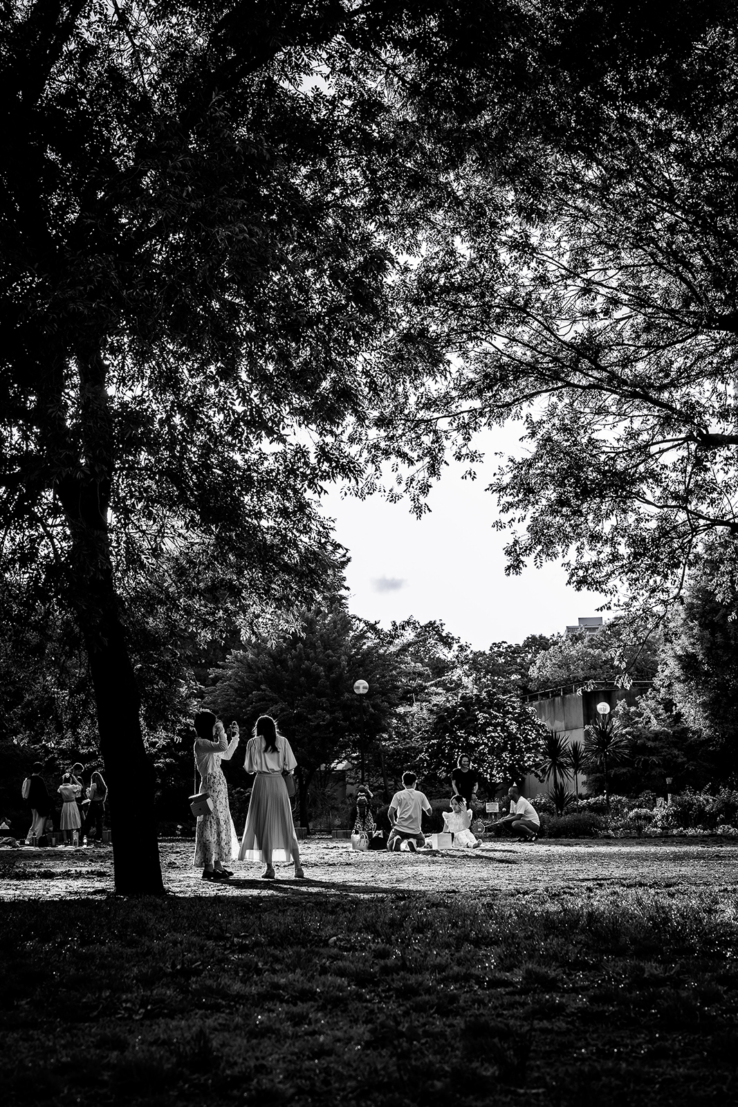 公園での何気ないワンシーンだと思いますが、逆光で撮影することで、人物の輪郭に光が当たり、点景ながらも一人一人がしっかりと浮き立ってきています。手前は木でシルエットとなり、奥の人物には光が当たっています。明暗差を生かして、明るいところへと視線誘導されます。左側の木の配置や中央付近の空間のあけ方など、人物の配置だけでなく、細かなところも見ながらフレーミングされています。