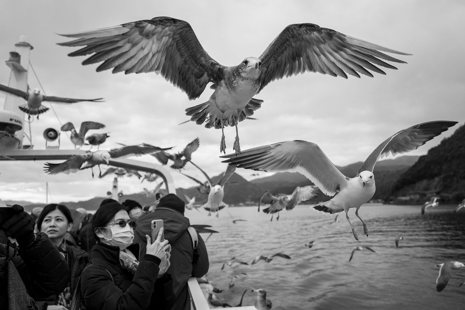 撮影者コメント : 伊根の舟屋に向かう観光船はインバウンド客でいっぱい。それをめがけてウミネコやカモメの集団が餌を目当てに襲い掛かる。鳥の群れと人の群れ、異なる秩序の共演。