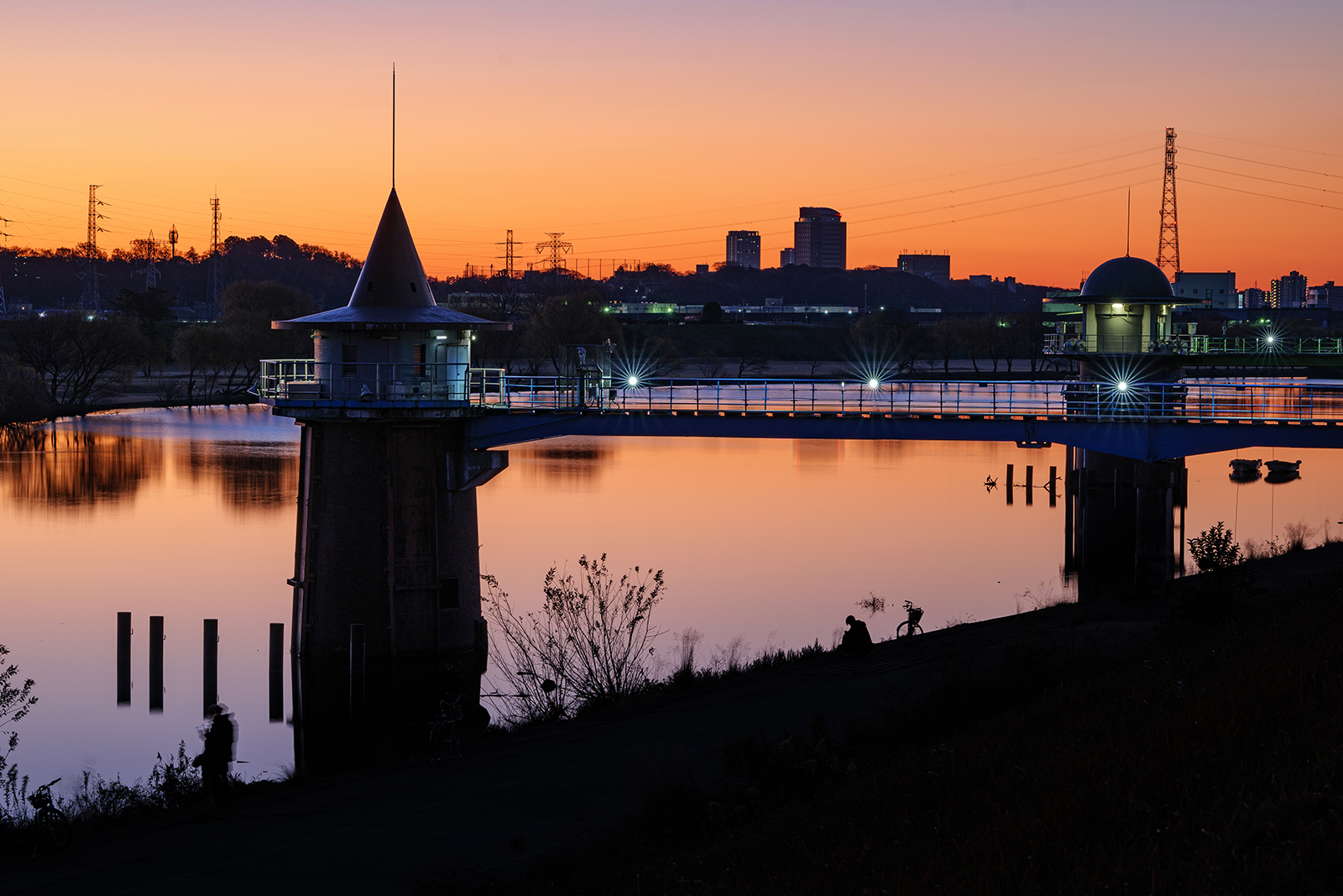 撮影者コメント : 葛飾区のシンボルである金町浄水場のとんがり帽子とまんまる帽子の取水塔。初日の出の朝焼けに染まる幻想的な風景を切り取ってみました。