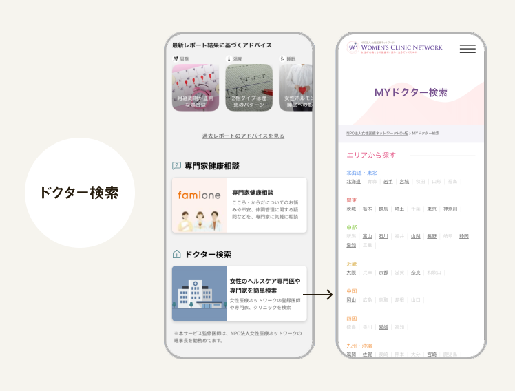 女性のヘルスケア領域に詳しい医師や専門家、クリニックを検索できる。