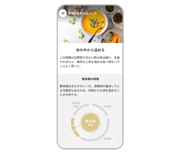 専用のウェアラブルデバイスとiOSアプリを使用して、女性の体調管理をサポートするサービスです。ウェアラブルデバイスで、あなたの温度や睡眠を自動的に測定し、そのデータをアプリで分析します。これにより、あなたの月経周期や体調を予測し、お知らせします。さらに、分析結果をもとに、あなたに合った体調を整えるためのアドバイスもお届けします。体調を入力すると、アプリがその情報を分析し、月経周期に伴う心身や睡眠状態の変化をお知らせします。これにより、自分自身のリズムを理解し、無理なく体調を整えるサポートを行います。※この商品は、体調管理のための予測やアドバイス、情報コンテンツを提供するサービスです。個別の診断や医療行為を行ったり、情報の正確性を保証するものではありません。