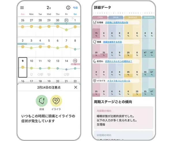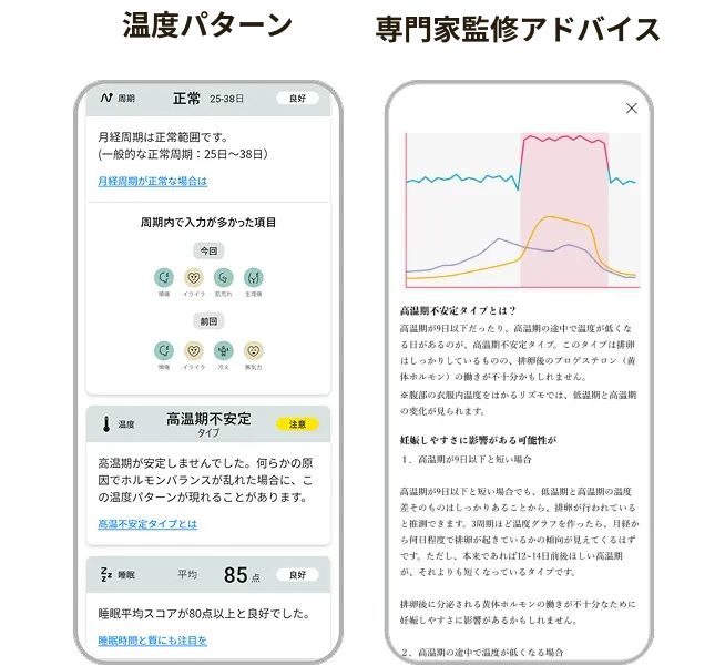 2相タイプ、高温期不安定タイプなど、ホルモンバランスに基づくパターンを分析してお知らせ