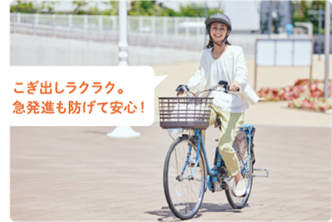 電動アシスト自転車とは、ペダルを漕ぐたびモーターが駆動して力をアシストしてくれる自転車のこと。軽い力でも加速できるため、走行時にかかる足の負担を軽減できます。