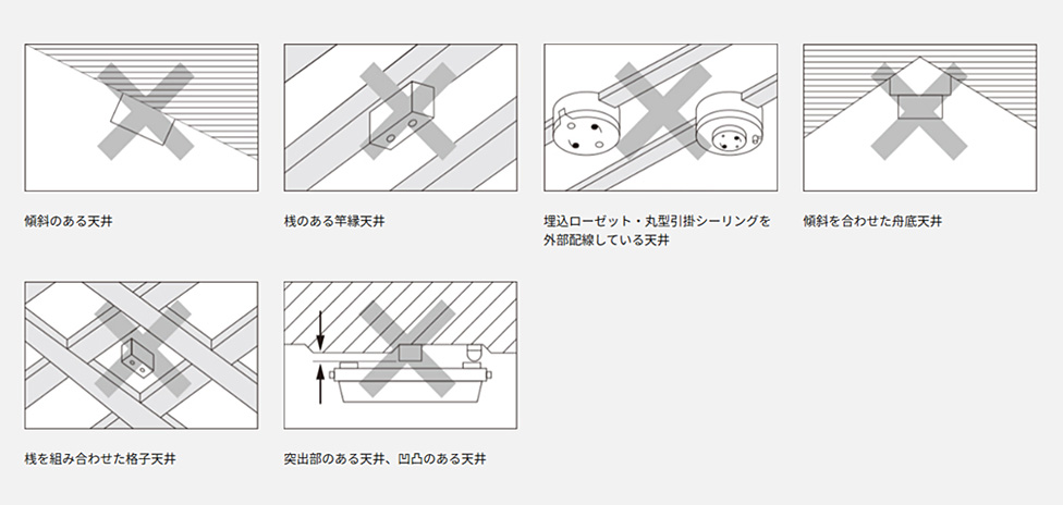 - ※下記の天井には取り付けできません。必ず平らな天井に取り付けてください。