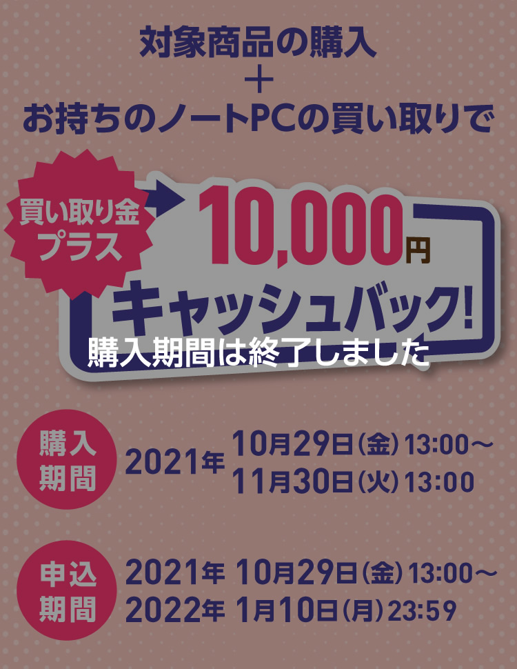 本キャンペーンは対象商品をご購入いただき、ノートPCを買い取りに出していただいたお客様が対象となります。