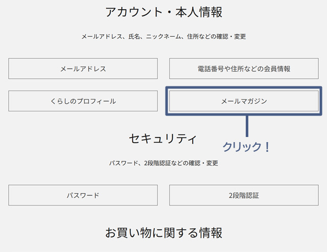 - STEP 3「アカウント・本人情報」から「メールマガジン」を選択
