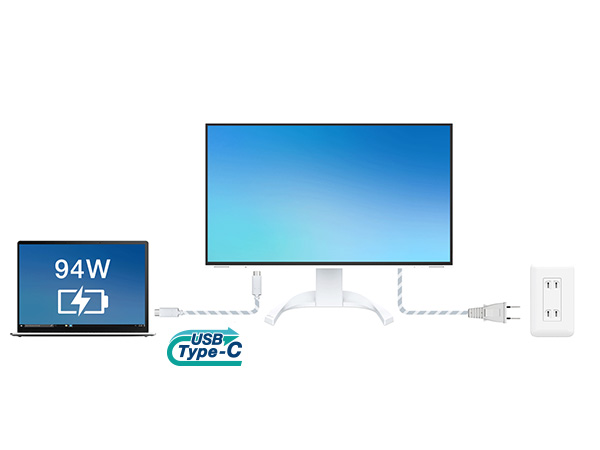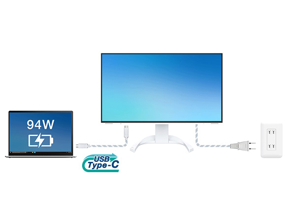 USB Type-Cケーブル1本の接続で、EIZOモニター最大の94W※をノートPCに給電します。