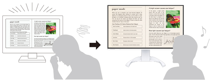 あたかも紙のような見え方に切替えできる「Paperモード」を搭載。一般的な液晶モニターに比べ、輝度、コントラスト比を抑え、画面を暖色系の色味にすることで、ブルーライトの量を低減。自動調光機能Auto EcoViewとの併用で、ブルーライトを約80%カットします。
