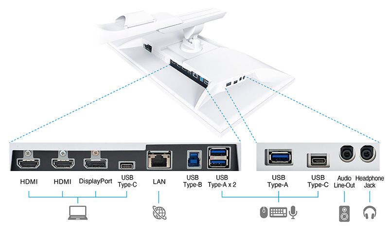 USB Type-C、DisplayPortをそれぞれ1系統、4K/60p、HDCP2.3対応のHDMIを2系統搭載。側面のUSBハブ(Type-A端子、Type-C端子)も利用することができます。全入力端子が4K/60pに対応しており、動画を滑らかに表示します。