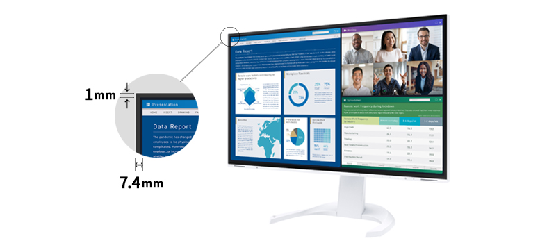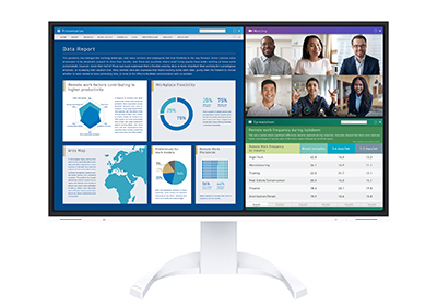 さまざまなウインドウを同時に表示しながら作業をする際、一画面に表示できる情報量は生産性に直結します。EV2740Xは広い画面とコンパクトさを兼ね備えた27型サイズで4K(3840 x 2160ピクセル)解像度に対応。フルHDの4倍の情報を一度に表示できるので、ウィンドウの切替えや画面のスクロールを頻繁に行う必要がなくなり、作業がはかどります。