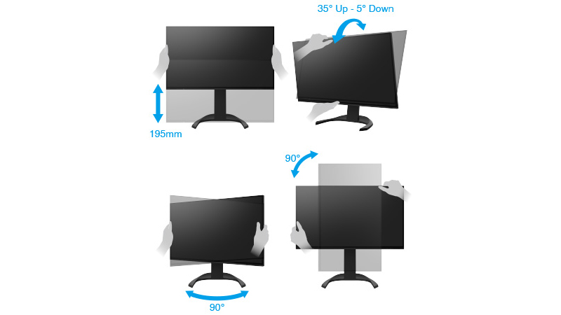昇降・チルト・スウィーベルの可動範囲が広く、作業しやすく疲れにくい快適な画面位置に無段階調整できます。Webページなどの縦に長いコンテンツ表示やマルチモニター用途に便利な縦回転も行えます。