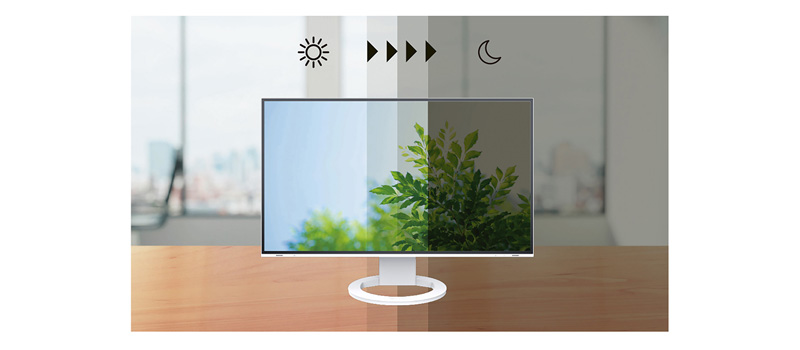 環境光を感知し、周囲の明るさに応じて画面の明るさを自動で調整するAuto EcoView機能を搭載。環境照度への画面の明るさの追従性を上げることで、より自然な調光に進化。目の疲れを軽減します。
