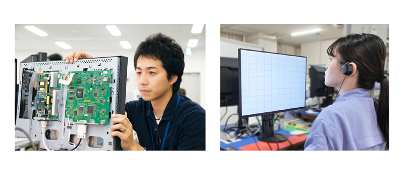 企画・開発から製造、アフターサービスまでをEIZO社にて実施。電子部品の実装工程では、最新設備によるミクロン単位での実装位置調整が行われ、高い品質水準を保った基板実装を実現しています。また、画面内の均一性検査など自動化された検査工程に加え、最終検査は人による目視検査をすることで、一台一台、入念な全数検査を実施。