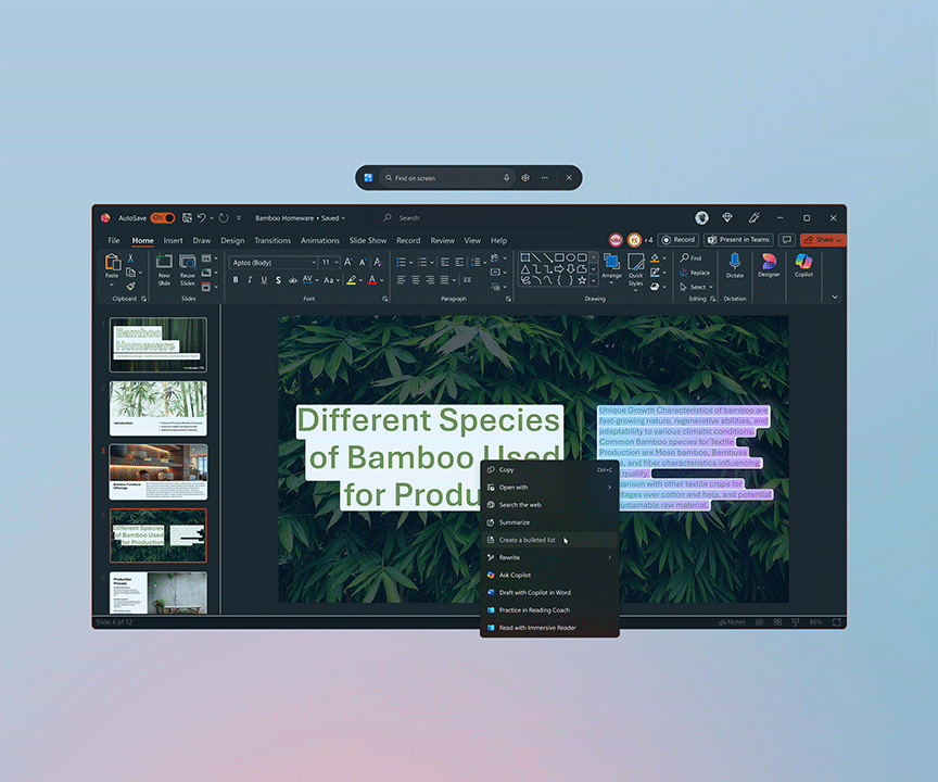 画面上のテキストや画像をハイライトすると、文章の要約や画像の共有、加工など、Click to Doが次のステップに向けた作業などを提案、実行することができます。