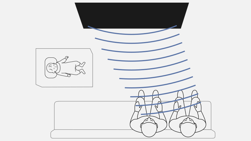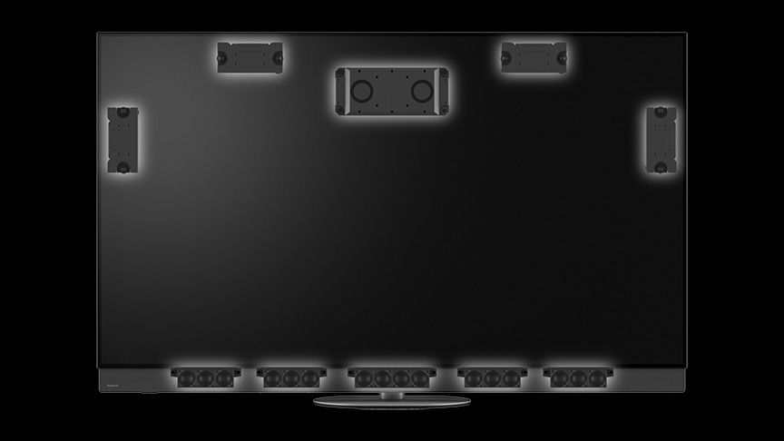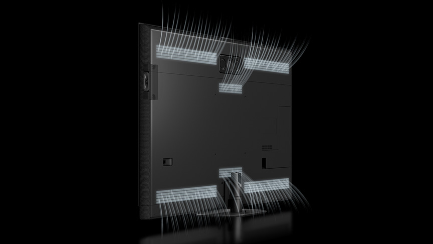 テレビ背面上部に設置されたスピーカーが、音を天井に反射させることで立体的で臨場感ある音を生み出しながら、音像を画面中央へと引き上げます。