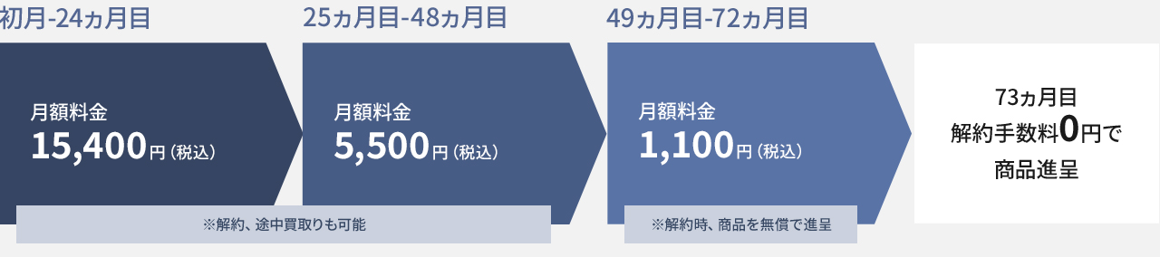 - ※49ヵ月以降(49ヵ月–72ヵ月)は月額1,100円(税込)。49ヵ月以降は解約時、解約手数料0円で商品を進呈します。