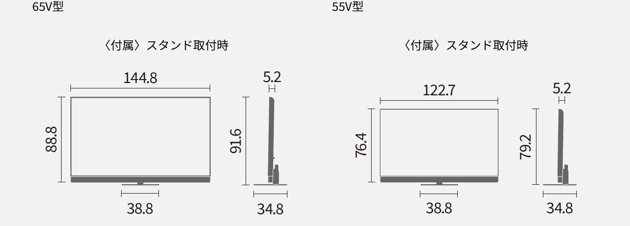 - ※2 転倒防止スタンドは、いかなる条件においても転倒・落下しないことを保証するものではありません。また、当社は、災害等によるテレビの転倒・落下に伴う損害については補償いたしかねます。使用上の注意を十分ご確認のうえ、ご使用ください。